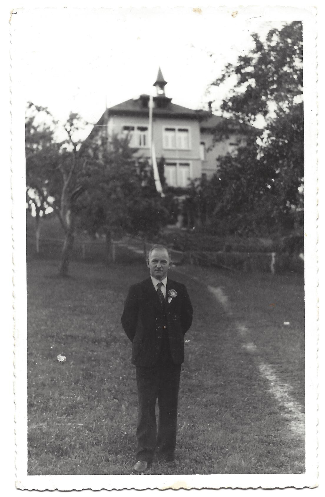 Lehrer Rickenmann vor dem Türmlischulhaus.